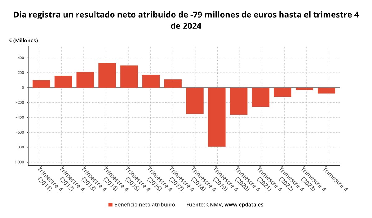 Grupo Dia ha cerrado 2024 con unas pérdidas de 78,7 millones de euros, lo que supone un incremento del 160% con respecto a sus 'números rojos' de 30 millones de euros del ejercicio anterior, impactada por los 107 millones de euros por la venta del negocio en Brasil.