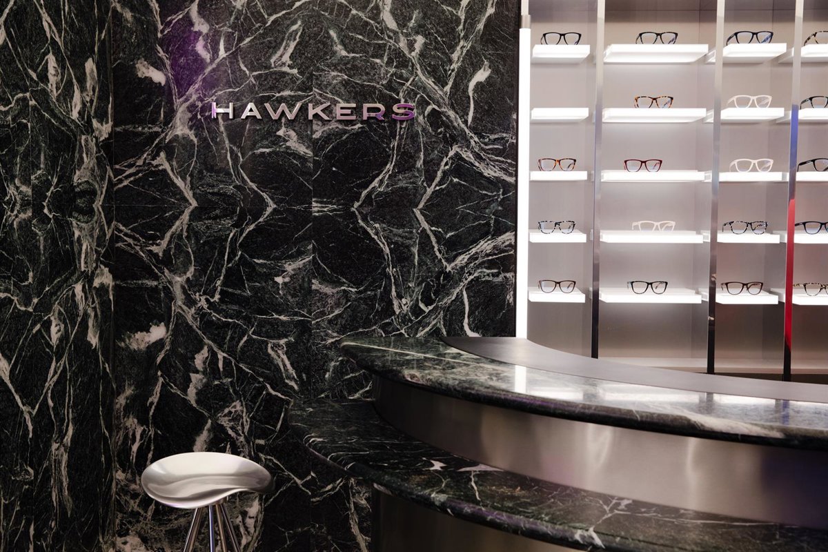 Un espacio que es reflejo de los valores del producto y la marca Hawkers, con una materialidad que mezcla mármol y acero inoxidable, respondiendo a ese cuidado por el detalle en el proceso de compra en que se ve envuelto el cliente en el establecimiento y ofrecer un producto al "alcance de todos".