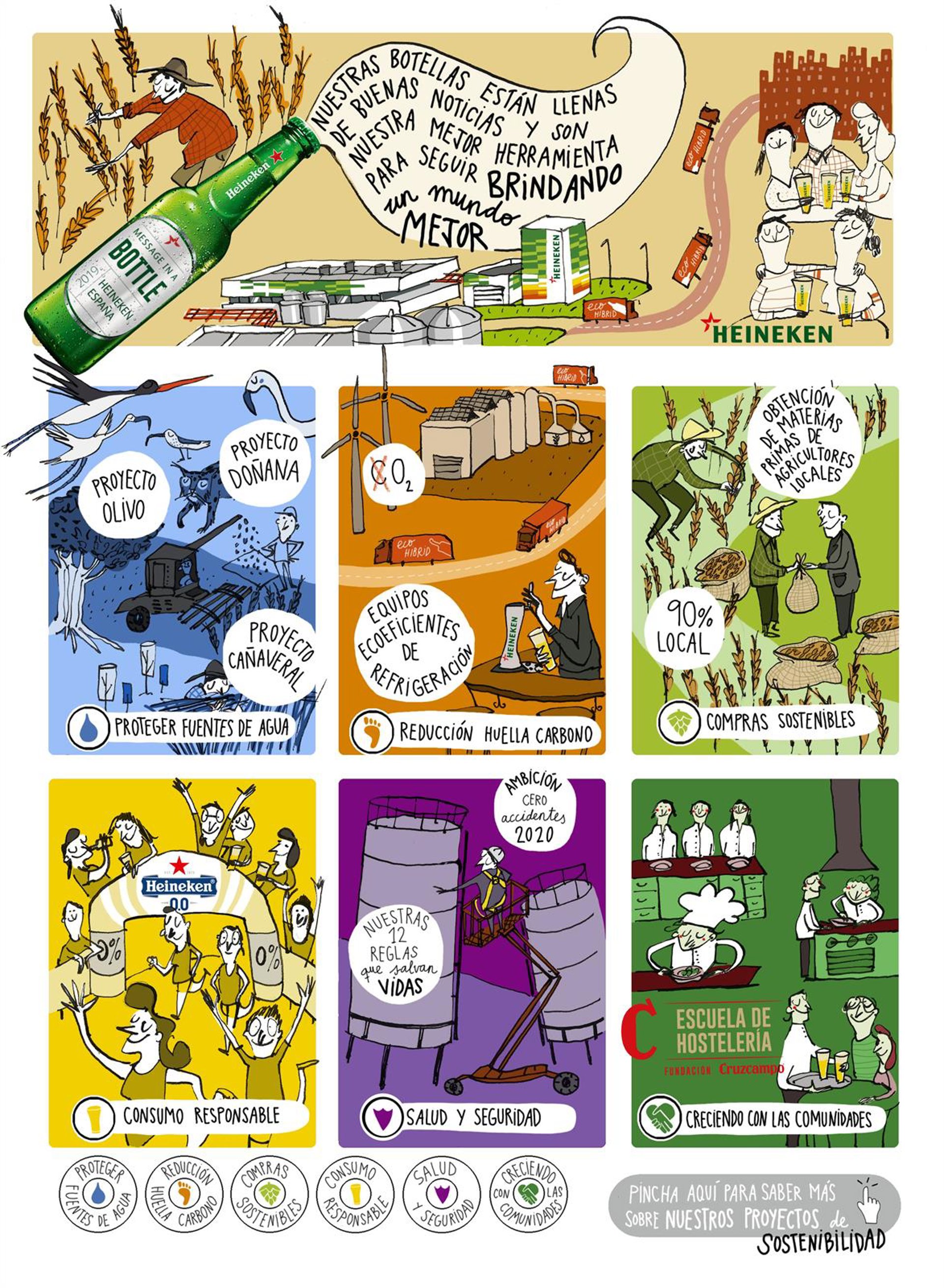 "Este trabajo me ha permitido aprender mucho sobre el mundo de la cerveza, su proceso de elaboración y, sobre todo, cómo interacciona con su entorno. Estoy muy ilusionada de colaborar en este proyecto, en el que he podido aportar el proceso creativo de la ilustración para poner en valor los esfuerzos que Heineken realiza cada día para cumplir con sus compromisos con la conservación y el respeto por el medio ambiente, la salud y la seguridad, el crecimiento de la agricultura local y la creación de empleo", ha indicado Enríquez.