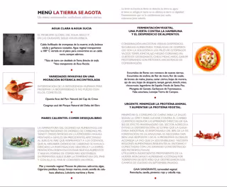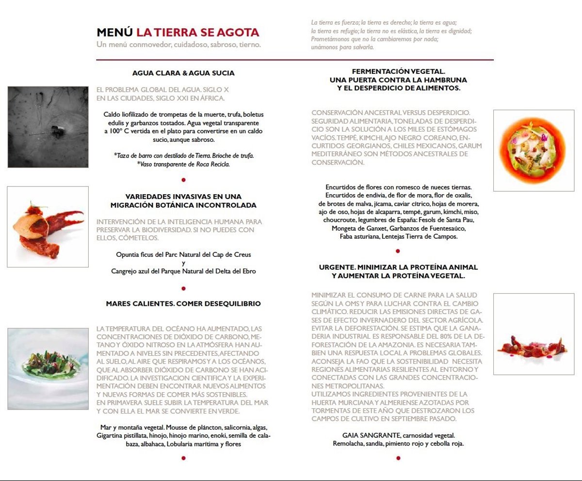 Le sigue la 'Fermentación vegetal. Una puerta contra la hambruna y el desperdicio de alimentos', con encurtidos de flores, endivias y legumbres. Tras éste, llega 'Urgente. Minimizar la proteína animal y aumentar la proteína vegetal', con remolacha, sandía, pimiento rojo y cebolla roja. El postre será a base de cacao de comercio justo y el café de comunidades africanas de Colombia. Finalmente, el menú estará maridado con caldos de dos bodegas catalanas afectadas por inundaciones e incendios, además de uno procedente de Chile, país que preside la COP25. Junto con ello, se sirve agua del deshielo de Pirineos, Kombucha y Ars Natura líquida.