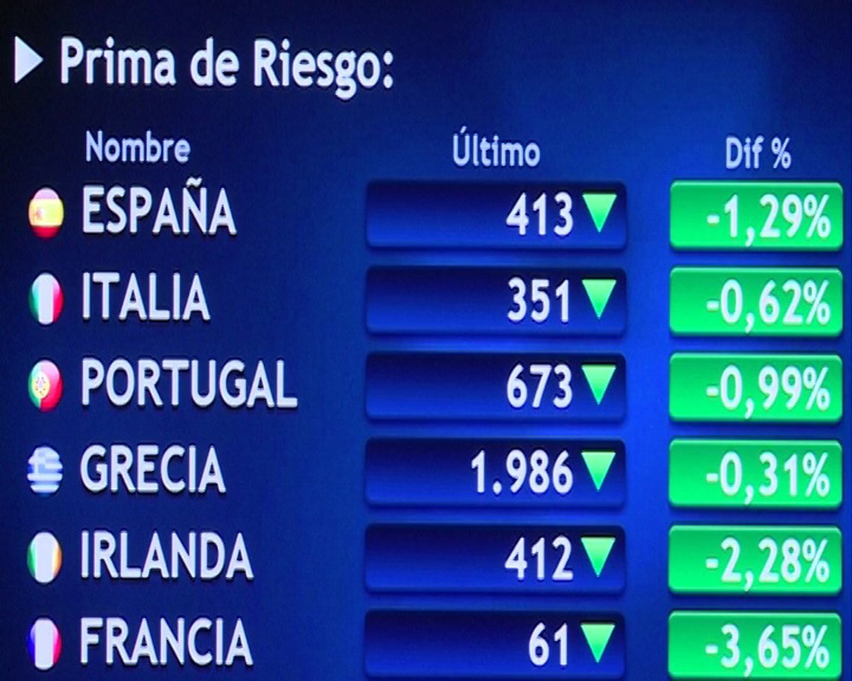 Al frente de las pérdidas, BME (-1,21%) y Bankia (-1,08%) siguieron a la textil. Mientras, la prima de riesgo española se mantenía estable en el entorno de los 400 puntos básicos, en niveles mínimos desde abril.
