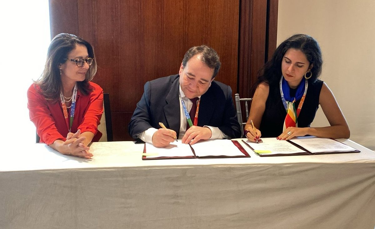 El presidente del ICO, Manuel Illueca, la gerente de Relaciones Institucionales Internacionales, Cristina Blaso, junto a la directora de personas, TI y Operaciones del Bndes, Helena Tenorio, han sido los encargados de rubricar el texto, en el marco de la Asamblea Anual de Alide 2025.