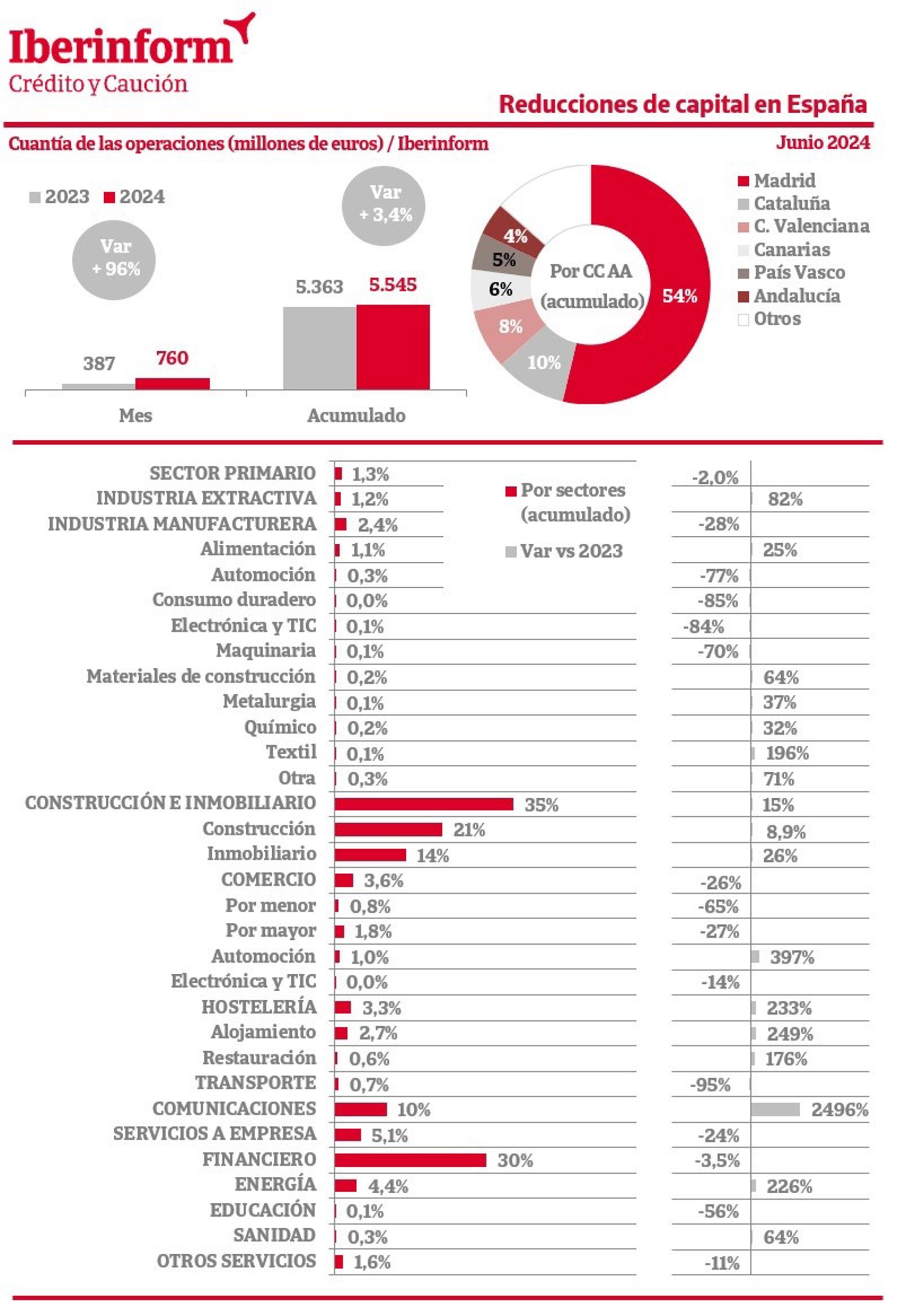 El importe de las reducciones de capital alcanzó los 5.545 millones de euros en el primer semestre del año, lo que supone un aumento del 3,4% en comparación con los 5.363 millones registrados durante la primera mitad de 2023, según Iberinform.