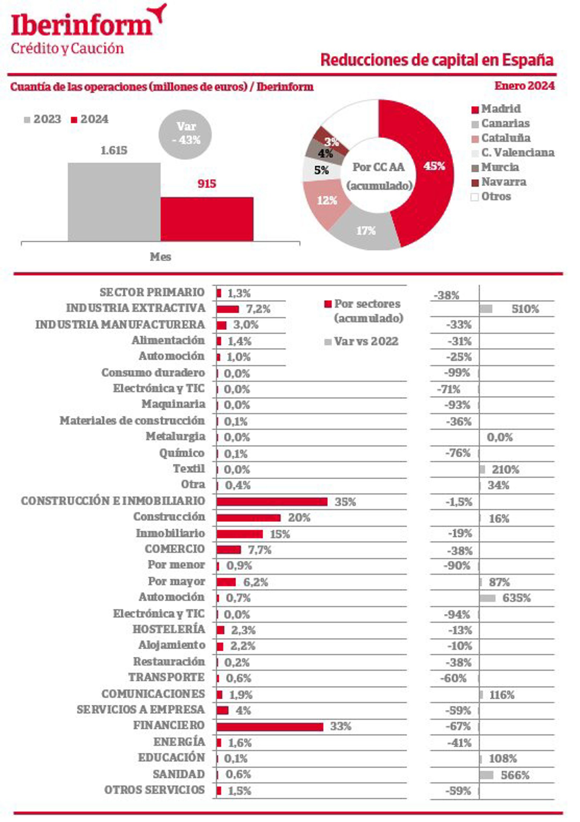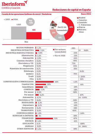 El importe total de las reducciones de capital ha caído en un 43% en enero, hasta los 915 millones de euros, frente a los 1.615 millones en el mismo mes de 2023, según Iberinform (Crédito y Caución), que analiza los datos del Registro Mercantil.
