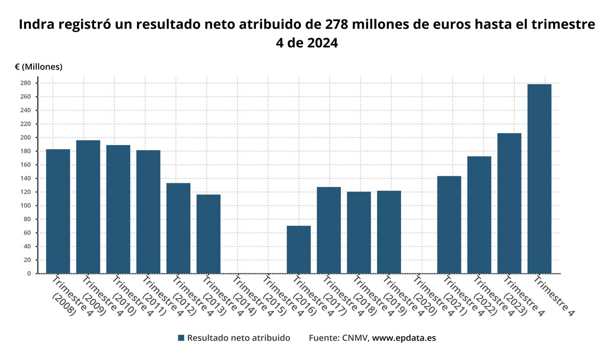 Indra registró un beneficio neto de 278 millones de euros en 2024, lo que supone un incremento de casi el 35% en comparación con los 206 millones de euros del ejercicio anterior, según las cuentas presentadas por la compañía este miércoles.