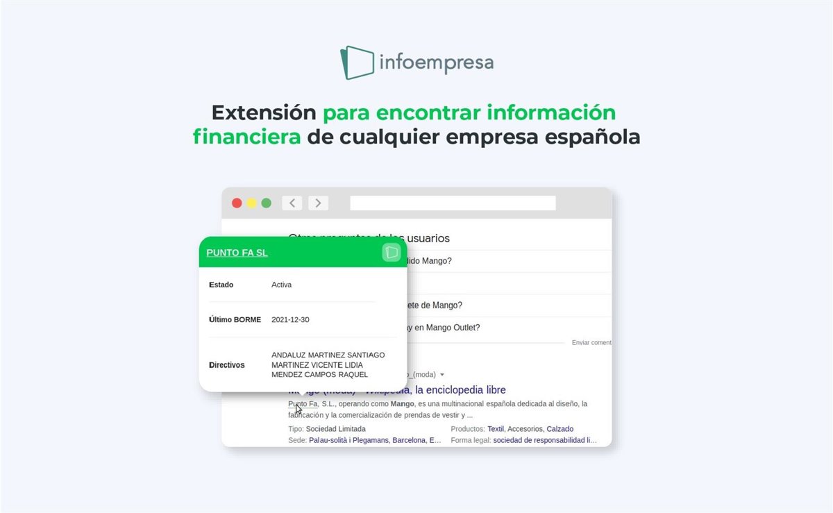 Infoempresa ha desarrollado una extensión de navegador que permite consultar en el momento de la búsqueda la información financiera de las empresas españolas, según ha informado la entidad en un comunicado.