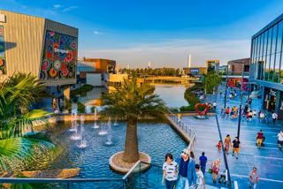 El complejo alberga unos doscientos locales comerciales, además de un lago artificial, un pista de patinaje, un punto de escalada, cines y una oferta de restauración.