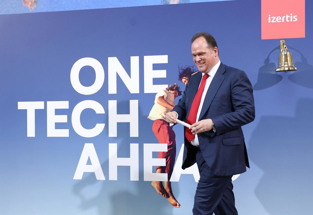 Archivo - El presidente y CEO de Izertis, Pablo Martín, con la cuerda de la campana tras romperse después de tocarla por el comienzo de la cotización de la compañía en el Mercado Principal de la Bolsa, en el Palacio de la Bolsa de Madrid, a 4 de julio de- Marta Fernández - Europa Press - Archivo