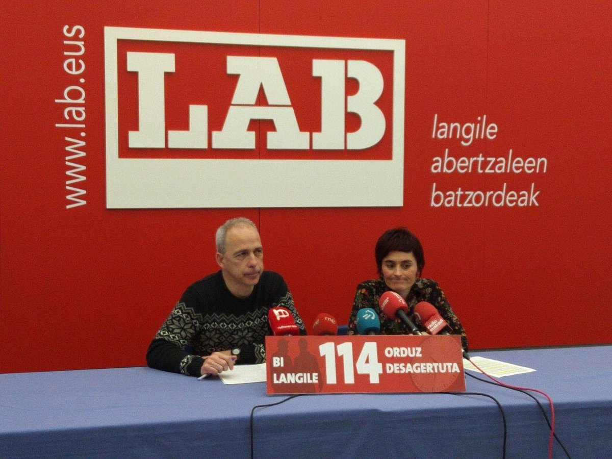 La secretaria general de LAB, Garbiñe Aranburu, y el secretario de Acción SIndical y Negociación Colectiva, Xabier Ugartemendia, en rueda de prensa en Bilbao. - EUROPA PRESS