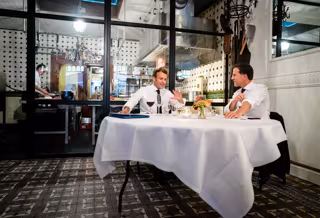 dpatop - 23 June 2020, Netherlands, The Hague: French PresidentEmmanuel Macron (L) and Dutch Prime Minister Mark Rutte sit at a table in the Cru restaurant in Scheveningen. Photo: -/ANP/dpa - -/ANP/dpa