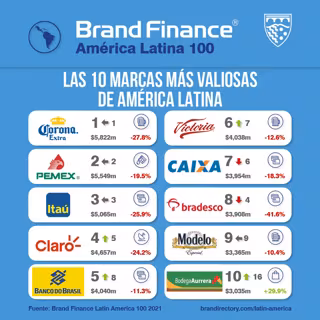 El top 10 se lo reparten solo dos países, México, con Corona, Pemex, Claro, Victoria, Modelo y Bodega Aurrerá y Brasil, con Itaú, Banco do Brasil, Caixa Económica Federal y Bradesco.