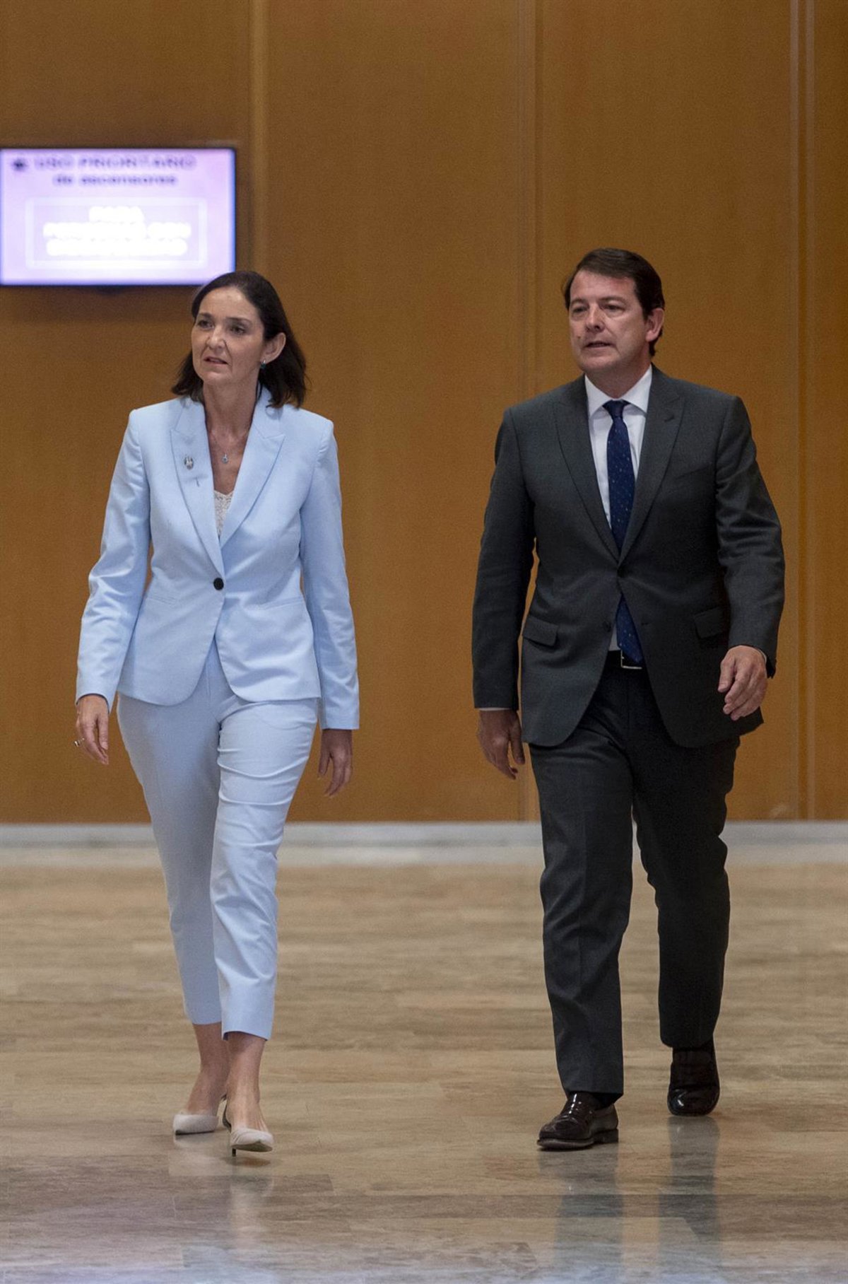 Ministra de Industria, Reyes Maroto, y presidente de la Junta de Castilla y León, Alfonso Fernández Mañueco, a su llegada a la firma del acuerdo entre comités de empresa de fábricas de Cerealto Siro en Castilla y León y de Davidson Kempner y Afendis - Alberto Ortega - Europa Press