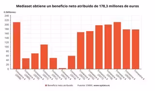 Mediaset España obtuvo un beneficio neto de 178,3 millones de euros en 2022, cifra un 1,5% inferior a la de 2021 y que representa un margen sobre ingresos netos del 20,6% y un beneficio por acción de 0,57 euros, según ha informado este jueves el grupo a la Comisión Nacional del Mercado de Valores (CNMV).
