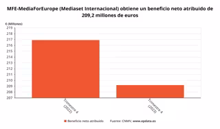 El conglomerado de medios de comunicación MFE-MediaForEurope (MFE) obtuvo un beneficio neto reportado de 209,2 millones de euros en 2023, lo que supone un descenso del 3,6% respecto a las ganancias registradas en el ejercicio anterior (216,9 millones), según ha informado este jueves la compañía, después de que su consejo de administración haya aprobado sus cuentas anuales por unanimidad.