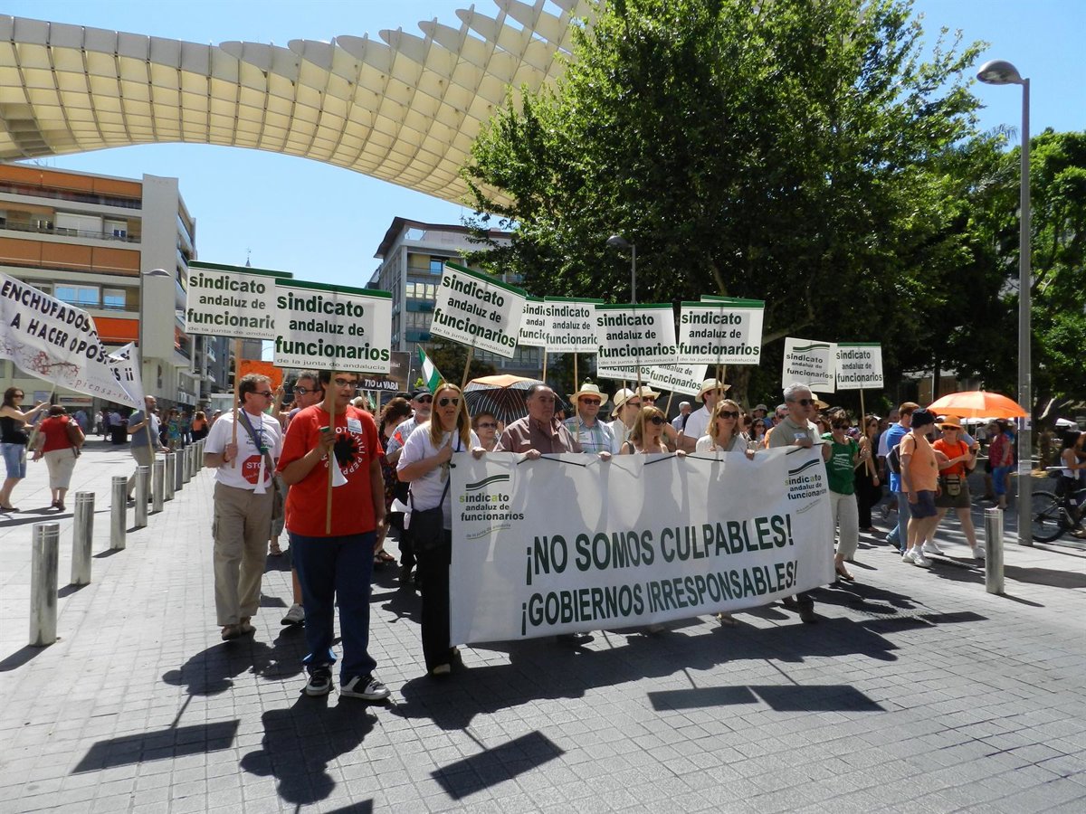 Miles de empleados públicos --unos 5.000, según los organizadores, y alrededor de 1.500, según los datos de la Delegación del Gobierno en Andalucía--, convocados por diversas plataformas y el sindicato Safja, se han manifestado este sábado en Sevilla para mostrar su rechazo a los ajustes planteados en el Plan Económico-Financiero de Reequilibrio para el 2012-2014 de la Junta de Andalucía, que contempla una rebaja de los salarios de este colectivo, y a la que le han exigido que recorte en la "duplicidad de gastos" que, en su opinión, genera la "administración paralela" del Gobierno andaluz.