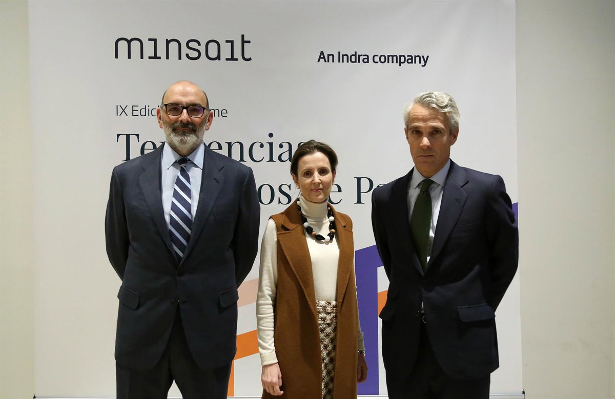 De izquierda a derecha: Fernando Abril-Martorell, presidente de Indra; Cristina Ruiz Ortega, consejera directora general de Indra; y Borja Ochoa, director general de Servicios Financieros de Minsait - INDRA
