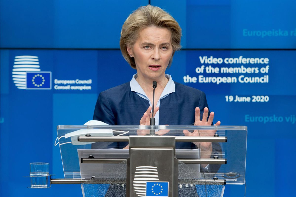HANDOUT - 19 June 2020, Belgium, Brussels: European Commission President Ursula von der Leyen speaks during a press conference following an European summit via videolink. Photo: Etienne Ansotte/European Commission/dpa - ATTENTION: editorial use only and - Etienne Ansotte/European Commiss / DPA