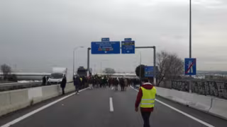Los manifestantes profieren consignas como "el taxi unido jamás será vencido'". El corte ha sorprendido a un vehículo VTC, que ha podido pasar sin incidentes.