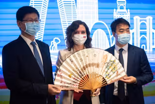 (I-D) El presidente de Huawei Europa, Li Peng; la presidenta de la Comunidad de Madrid, Isabel Díaz Ayuso y el presidente y CEO Huawei España, Eric Li, posan con un abanico que la presidenta de la Comunidad de Madrid, ha recibido como muestra de agradec - Gustavo Valiente - Europa Press