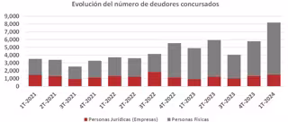 En el primer trimestre del año el número de deudores concursados se ha elevado hasta los 8.199, lo que supone un incremento del 67,5% respecto al mismo período del año anterior y un aumento del 41,8% respecto al trimestre anterior, según el Colegio de los Registradores.