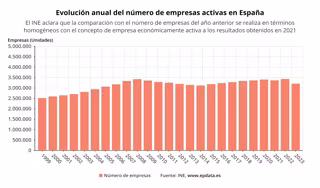 El número de empresas activas en España aumentó un 0,5% durante el año 2022, hasta las 3.207.580 sociedades activas, según la actualización del Directorio Central de Empresas (Dirce) publicada este jueves por el Instituto Nacional de Estadística (INE).