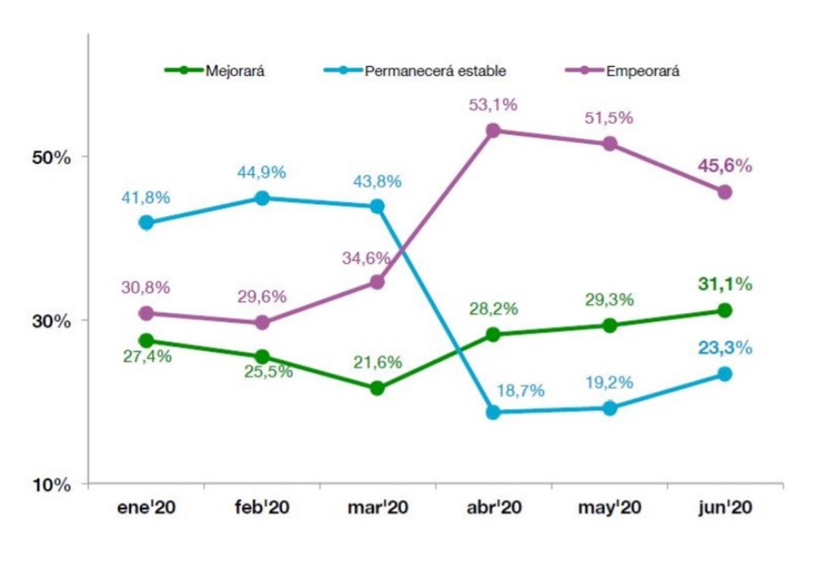 Según el último informe del Observatorio Cetelem Mensual, relativo al primer semestre de este año, si en mayo un 51,5% de los encuestados creía que la situación empeoraría con el tiempo, en junio, solo un 45,6% defendía esta posición más pesimista.