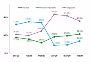 Igualmente, la percepción del consumidor sobre su situación personal, que había iniciado el 2020 con un leve aumento, comenzó a presentar una bajada a partir del mes de marzo (6,39) hasta situarse en el 6,15 en el mes de junio.