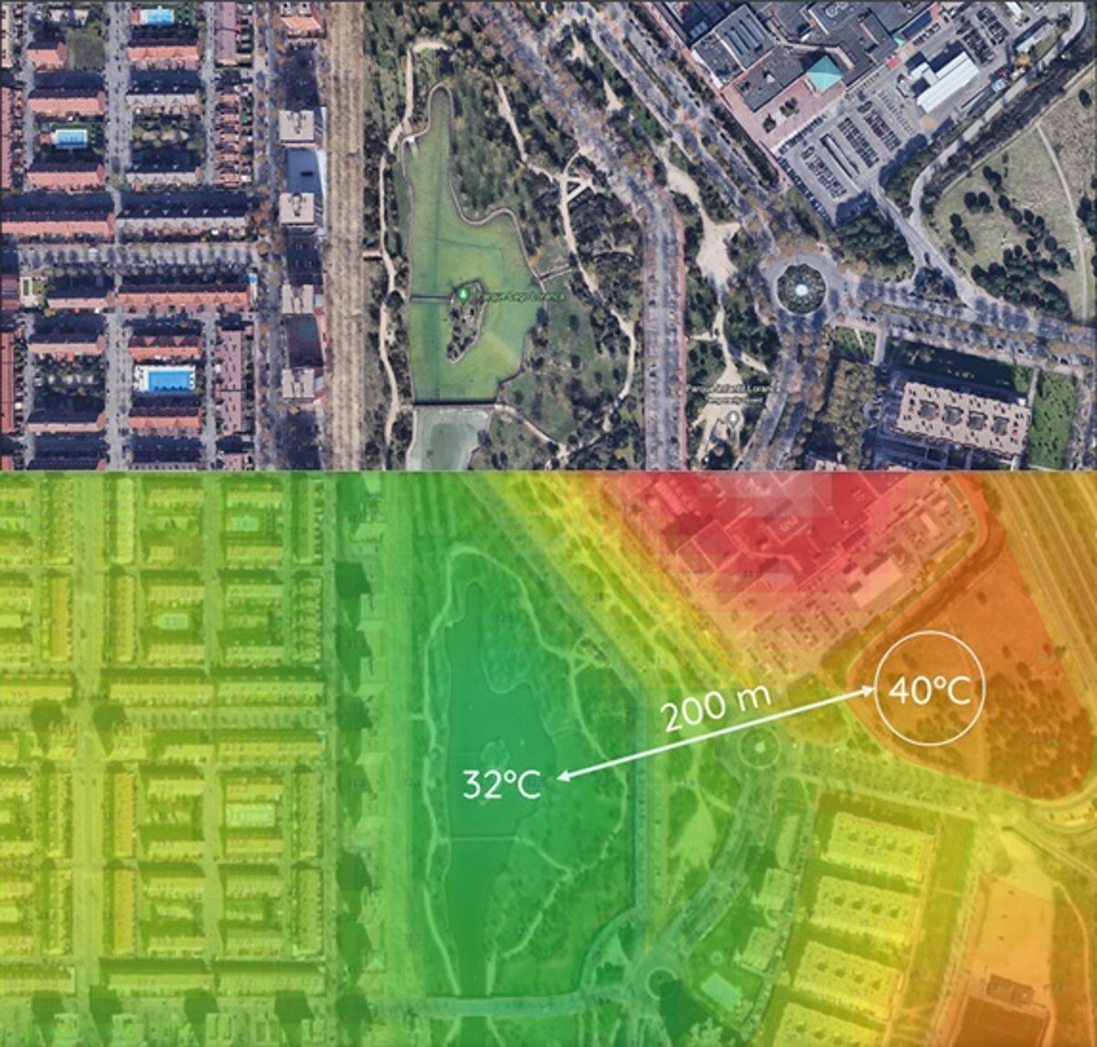 Implementado por primera vez en el Ayuntamiento de Fuenlabrada (Madrid), facilita la realización de un inventario de elementos, especies y caracterización de salud para la gestión de zonas verdes, así como de mapas de calor de superficie (islas de calor urbanas).