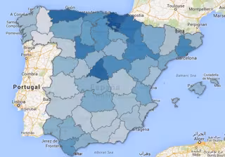 En el siguiente mapa interactivo puedes comprobar, pinchando sobre cada comunidad autónoma, la pensión media que se percibe en cada comunidad autónoma, así como el porcentaje que representa sobre la pensión media nacional. Cuanto más intenso es el azul, más elevada es la pensión media.