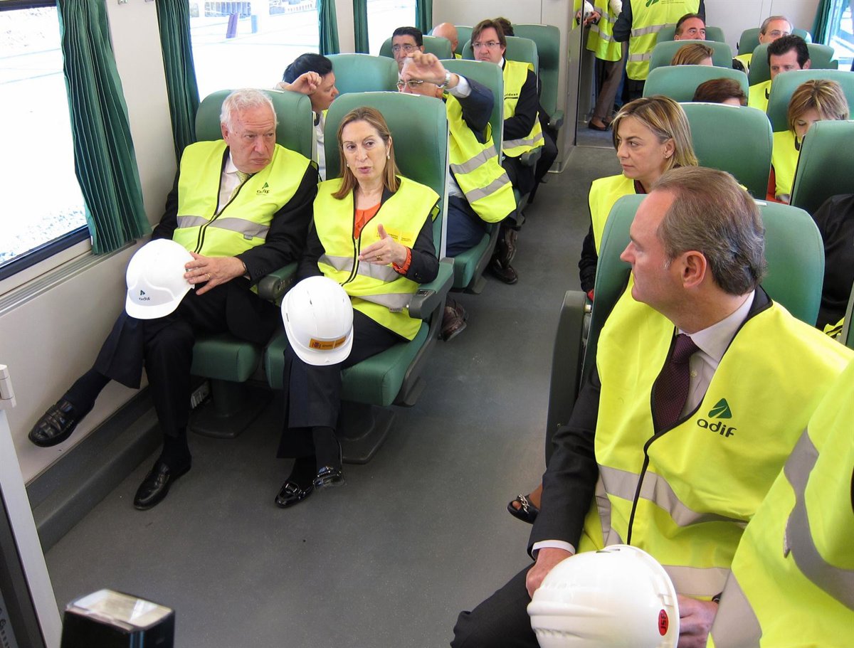 Posteriormente, la ministra, junto a García Margallo y Fabra, se han desplazado en un tren de pruebas del Administrador de Infraestructuras Ferroviarias (Adif), empleado para el análisis de las vías, hasta el Puesto de Adelantamiento y Estacionamiento de Trenes (PAET) de Monforte del Cid (Alicante), donde la línea procedente de Albacete se bifurca en dos ramales, uno hacia la capital alicantina y otro hacia Elche, Murcia y la comarca de la Vega Baja.