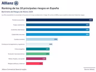 La pérdida de beneficios es la principal preocupación para el 40% de las empresas españolas en 2024, seguida por los incidentes cibernéticos, los incendios y explosiones, y catástrofes naturales, según el 'Barómetro de Riesgos de Allianz' publicado este martes.