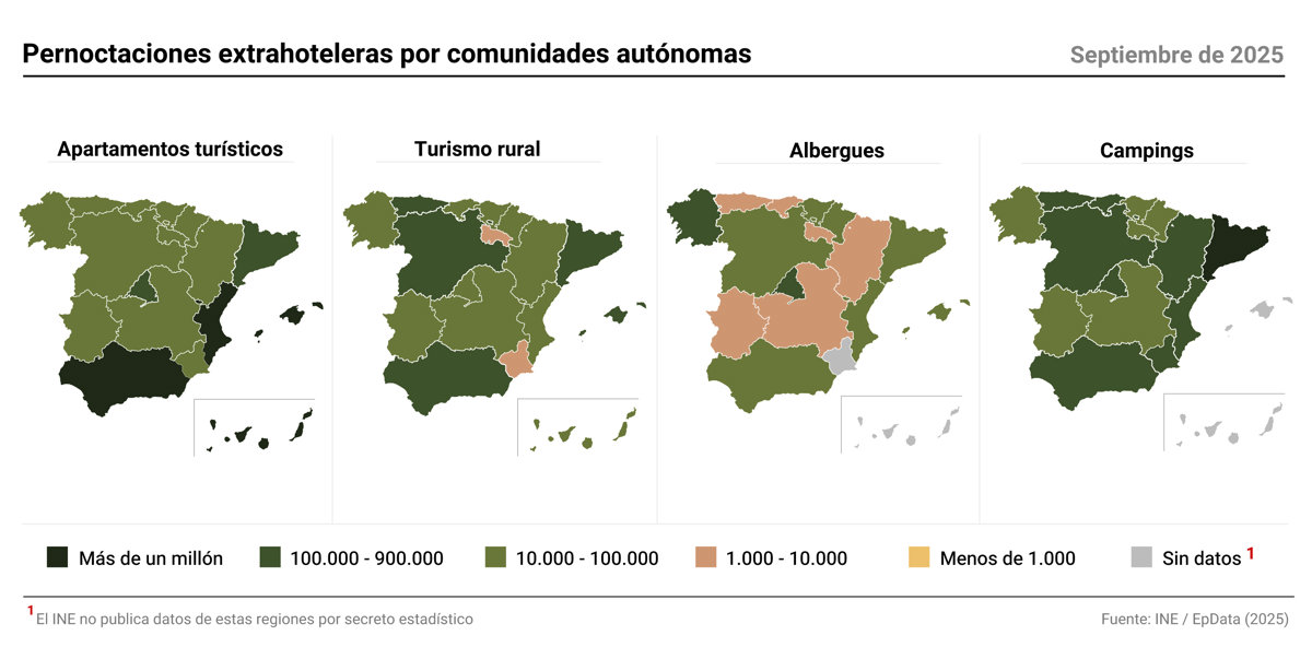 Los datos del INE también registran un incremento de precios en todas las categorías. El Índice de Precios de Apartamentos Turísticos (IPAP) subió un 1,9% en septiembre respecto al mismo mes de 2024, el Índice de Precios de Campings (IPAC) un 3,2% y el Índice de Precios de Turismo Rural (IPTR) un 10,9%.