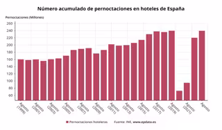 Los datos de coyuntura turística hotelera del instituto estadístico muestran que durante los ocho primeros meses de 2023 las pernoctaciones hotelera en nuestro país se incrementaron un 8,8% respecto al mismo periodo del año anterior. Además, superan las de los ocho primeros meses del año 2019.
