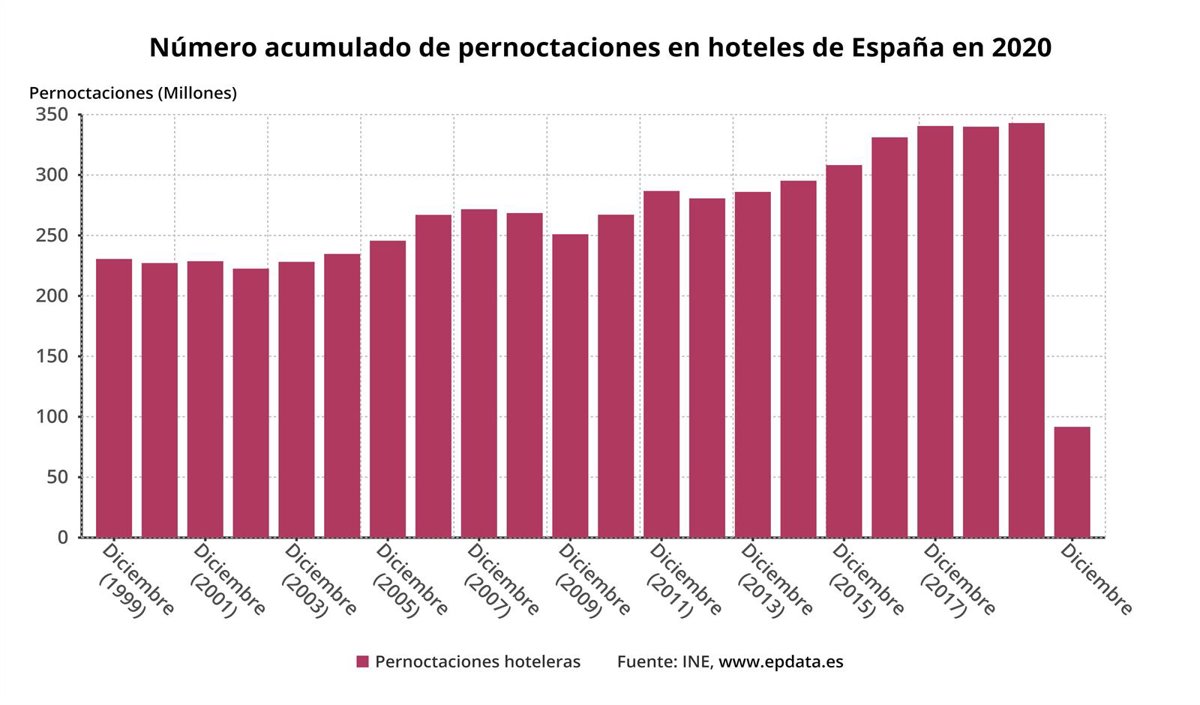 A esta caída del 73,3% registrada en 2020 se llegó después de que en el último mes del año las pernoctaciones en hoteles españoles se desplomaran por tercer mes consecutivo más de un 80%. En concreto, las pernoctaciones hoteleras descendieron en diciembre un 81,2%, totalizando 3,1 millones.