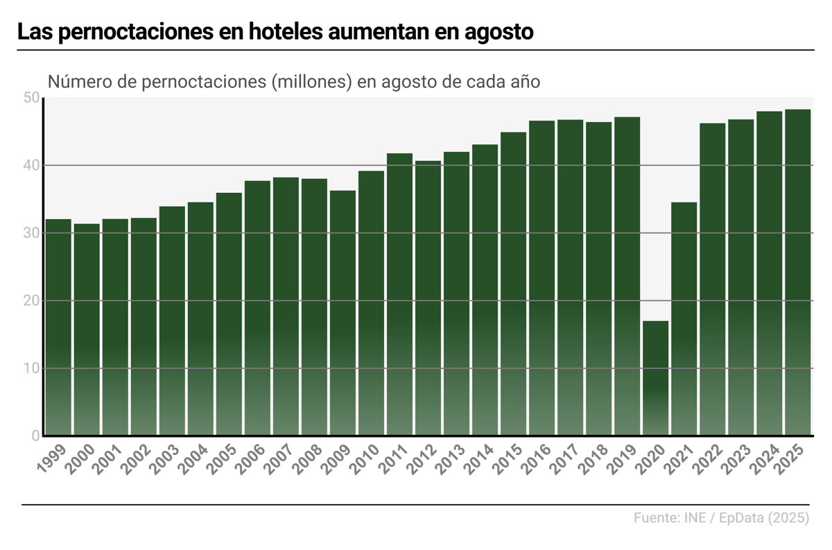Los establecimientos hoteleros españoles registraron en agosto un incremento interanual del 0,9% en las pernoctaciones, superando la cifra de 48,18 millones, máximo histórico para el octavo mes del año, pese a que los precios aumentaron un 5,8% en comparación con igual mes de 2024, su mayor alza desde el pasado mes de abril.