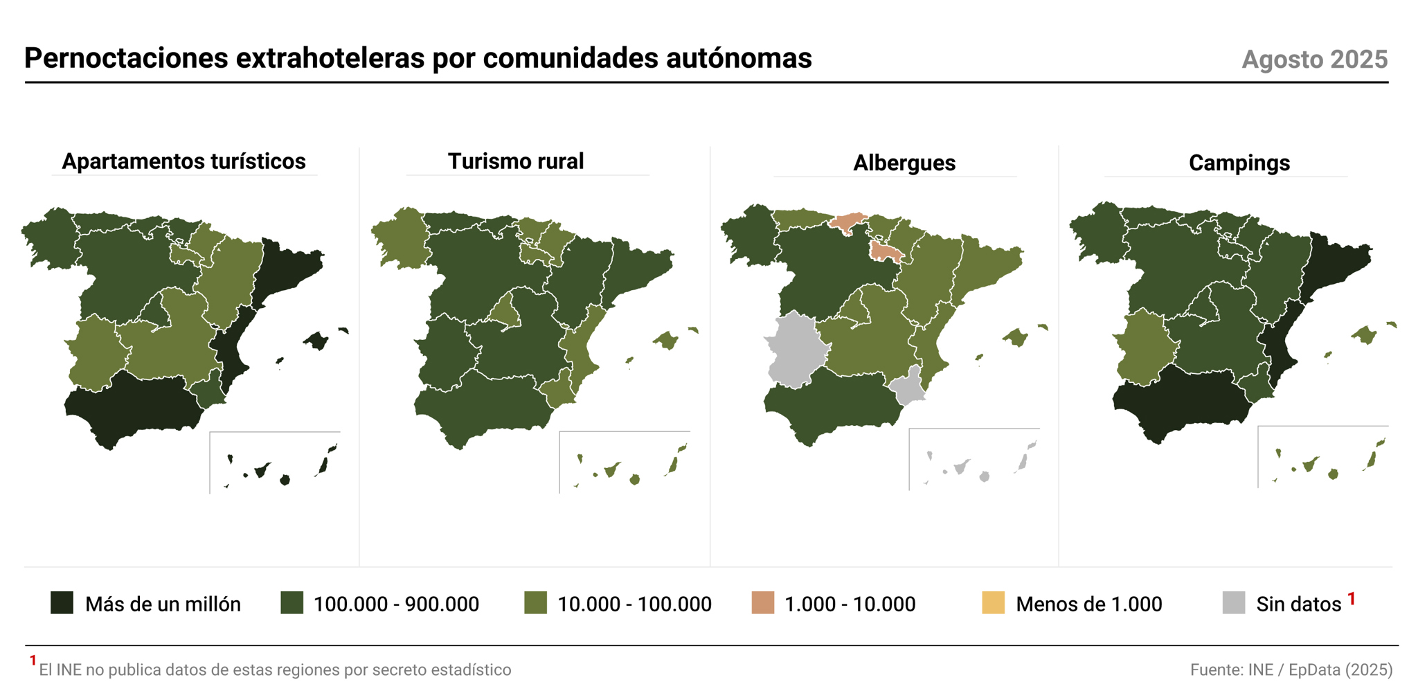 Las pernoctaciones en alojamientos turísticos extrahoteleros españoles (apartamentos, campings, alojamientos de turismo rural y albergues) superaron la cifra de 26,1 millones en agosto, lo que supone un aumento del 0,6% respecto al mismo mes del año pasado, según datos del Instituto Nacional de Estadística (INE) publicados este miércoles.