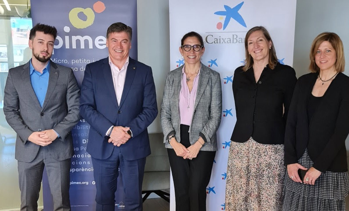 La iniciativa se enmarca en la renovación del acuerdo de colaboración de Pimec y CaixaBank, que han firmado su presidente, Antoni cañete, y su directora territorial en Barcelona, Maria Alsina, respectivamente.