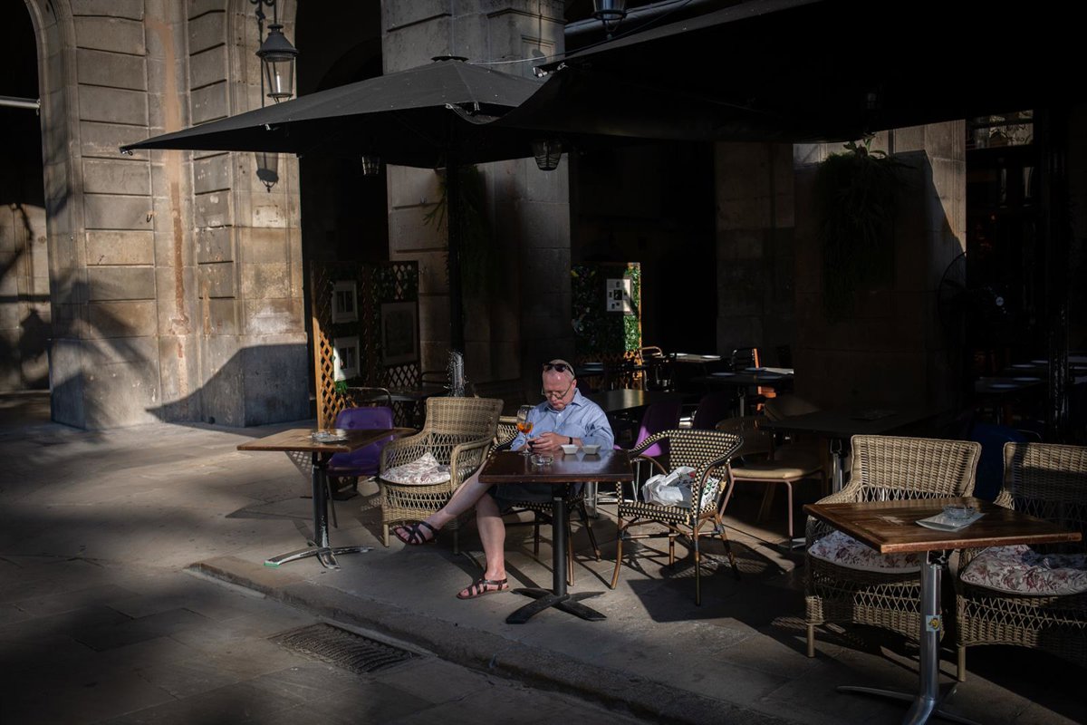 Un hombre consulta su teléfono móvil en la terraza de un bar en Barcelona, Cataluña (España) a 14 de octubre de 2020. - David Zorrakino - Europa Press
