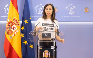 La secretaria general de Podemos, Ione Belarra, con una camiseta sobre la Constitución en la que se lee "Y cumplirla, ¿pa' cuando?" durante una rueda de prensa, en el Congreso de los Diputados, a 17 de febrero de 2026, en Madrid (España). - Eduardo Parra - Europa Press