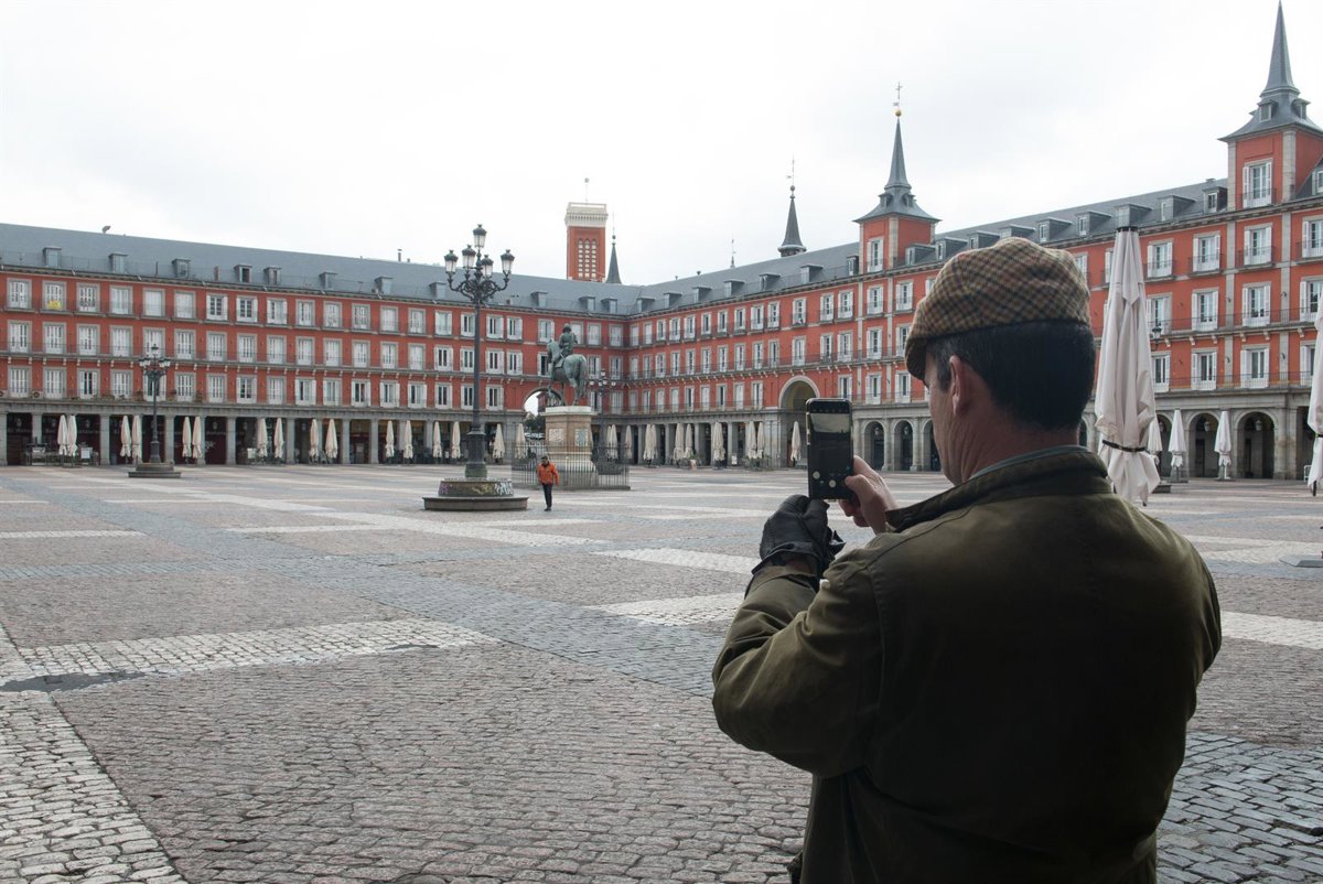 Un hombre hace una foto con su móvil a la céntrica Plaza Mayor de Madrid, vacía durante el estado de alarma decretado por el coronavirus, en Madrid (España) - Joaquin Corchero / Europa Press - Archivo