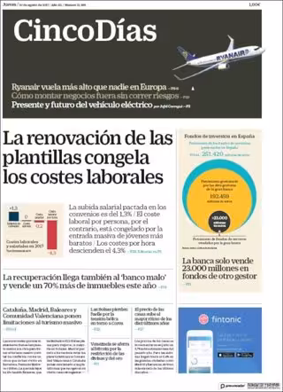 CINCO DÍAS: "La renovación de las plantillas congela los costes laborales"; "La recuperación llega también al 'banco malo' y vende un 70% más de inmuebles este año"; "La banca solo vende 23.000 millones en fondos de otro gestor"; "Cataluña, Madrid, Baleares y Comunidad Valenciana ponen limitaciones al turismo masivo".