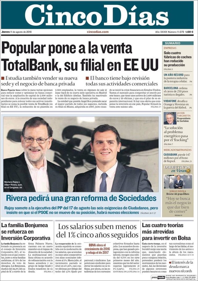 CINCO DÍAS: "Popular pone a la venta TotalBank, su filial en EEUU"; "Rivera pedirá una gran reforma de Sociedades"; "Los salarios suben menos del 1% cinco años seguidos"; "Las cuatro teorías más atrevidas para invertir en Bolsa"; "La familia Benjumea se refuerza en Inversión Corporativa".