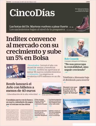 CINCO DÍAS: "Inditex convence al mercado con su crecimiento y sube un 5% en Bolsa"; "Renfe lanzará el Avlo con billetes a menos de 40 euros"; El consejero delegado de Wallapop, Rob Cassedy: "No nos preocupa la rentabilidad, sino seguir creciendo".