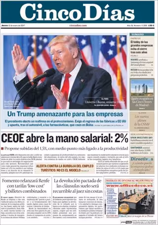CINCO DÍAS: "Un Trump amenazante para las empresas"; "CEOE abre la mano salarial: 2%"; "Alerta contra la burbuja del empleo turístico: No es el modelo"; "Fomento relanzará Renfe con tarifas 'low cost' y billetes combinados"; "La devolución pactada de las cláusulas suelo será recurrible al juez sin costas".