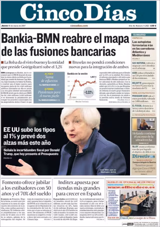 EL ECONOMISTA: "Bankia absorbe BMN casi sin ajustes y mejora la rentabilidad"; "EEUU subirá tipos dos veces más este año"; "Inditex no teme a Trump: crecerá más en Estados Unidos y México"; "PP y PNV avanzan para cerrar los Presupuestos sin depender del PSOE"; "Fomento ofrece prejubilaciones a la estiba con el 70% del sueldo".