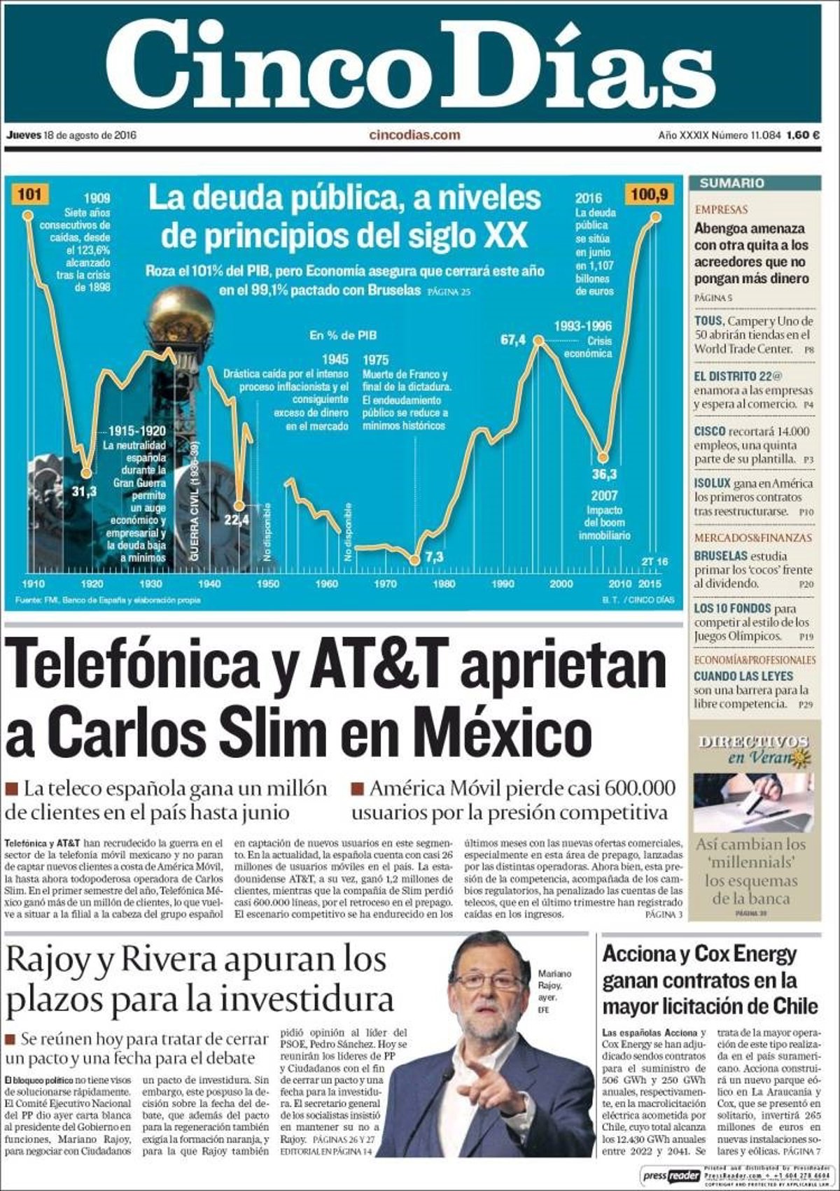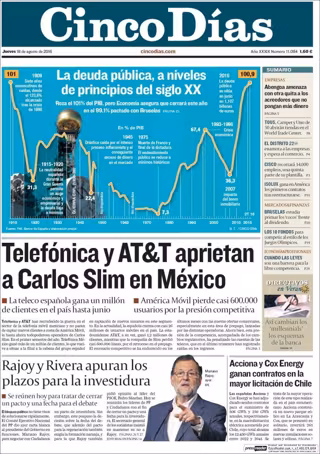 CINCO DÍAS: "La deuda pública, a niveles de principios del siglo XX"; "Telefónica y AT&T aprietan a Carlos Slim en México"; "Rajoy y Rivera apuran los plazos para la investidura"; "Acciona y Cox Energy ganan contratos en la mayor licitación de Chile"; "Abengoa amenaza con otra quita a los acreedores que no pongan más dinero".