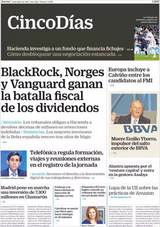 CINCO DÍAS: "BlackRock, Norges y Vanguard ganan la batalla fiscal de los dividendos"; "Telefónica regula formación, viajes y reuniones externas en el registro de la jornada"; "Muere Emilio Ybarra, impulsor del salto exterior de BBVA".