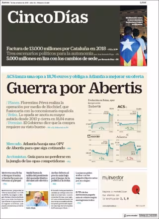 EXPANSIÓN: "Opa de ACS sobre Abertis a 18,76 euros"; "ACS subió más del 5% en Bolsa y Abertis se disparó un 7%"; "Rajoy frenará el 155 si hay elecciones en Cataluña".