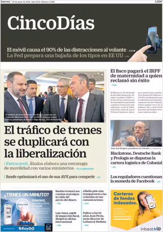CINCO DÍAS: "El tráfico de trenes se duplicará con la liberalización"; "El fisco pagará el IRPF de maternidad a quien reclamó sin éxito"; "Blackstone, Deutsche Bank y Prologis se disputan la cartera logística de Colonial".