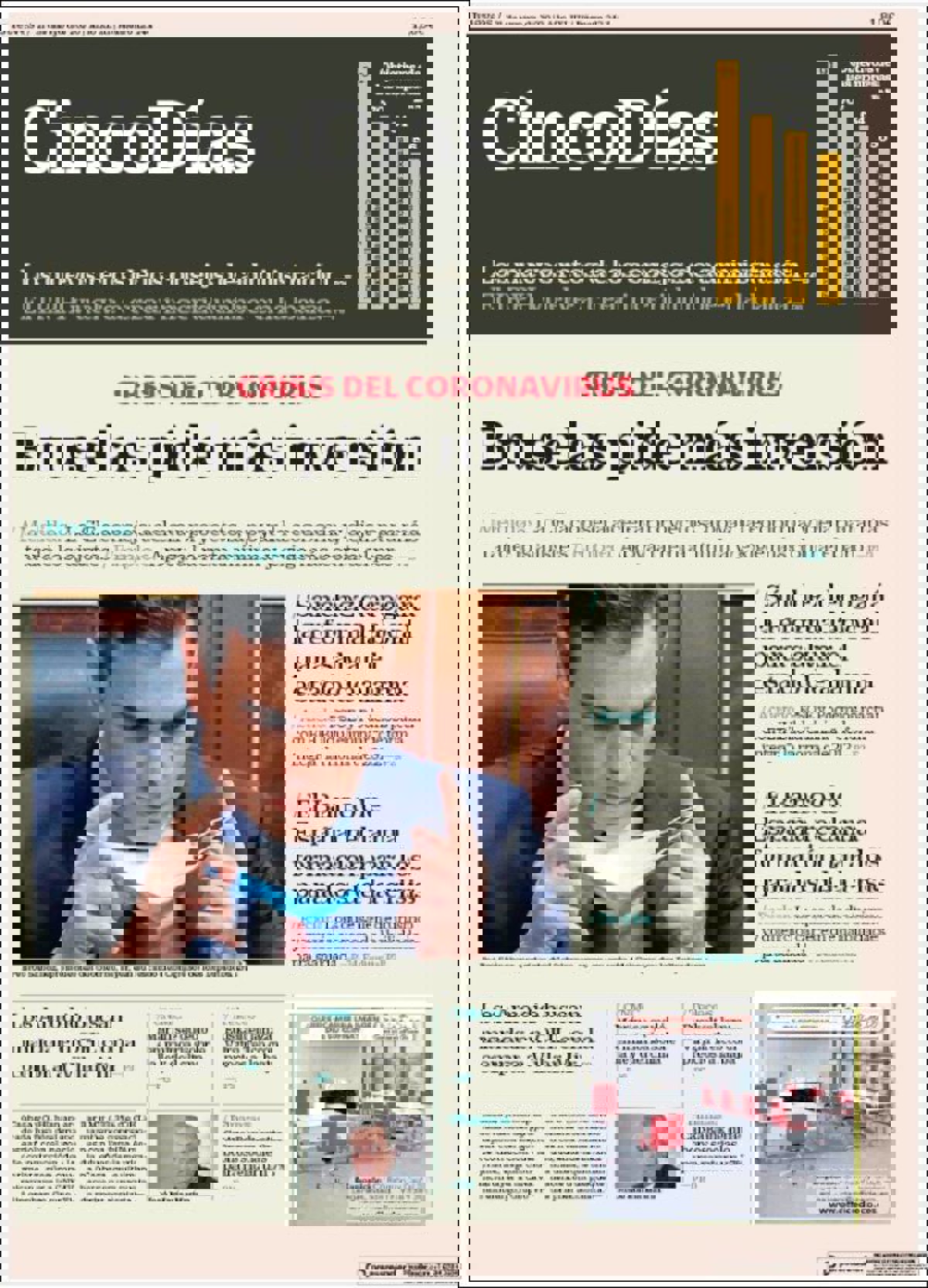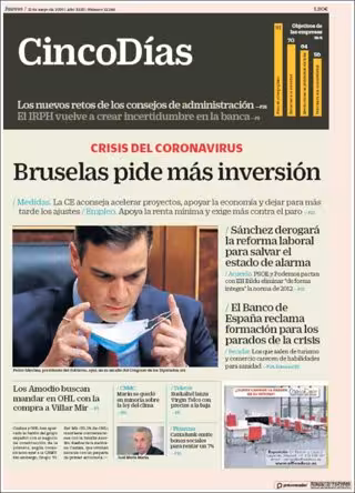 CINCO DÍAS: "Bruselas pide más inversión"; "Sánchez derogará la reforma laboral para salvar el estado de alarma"; "El Banco de España reclama formación para los parados de la crisis"; "Los Amodio buscan mandar en OHL con la compra a Villar Mir".